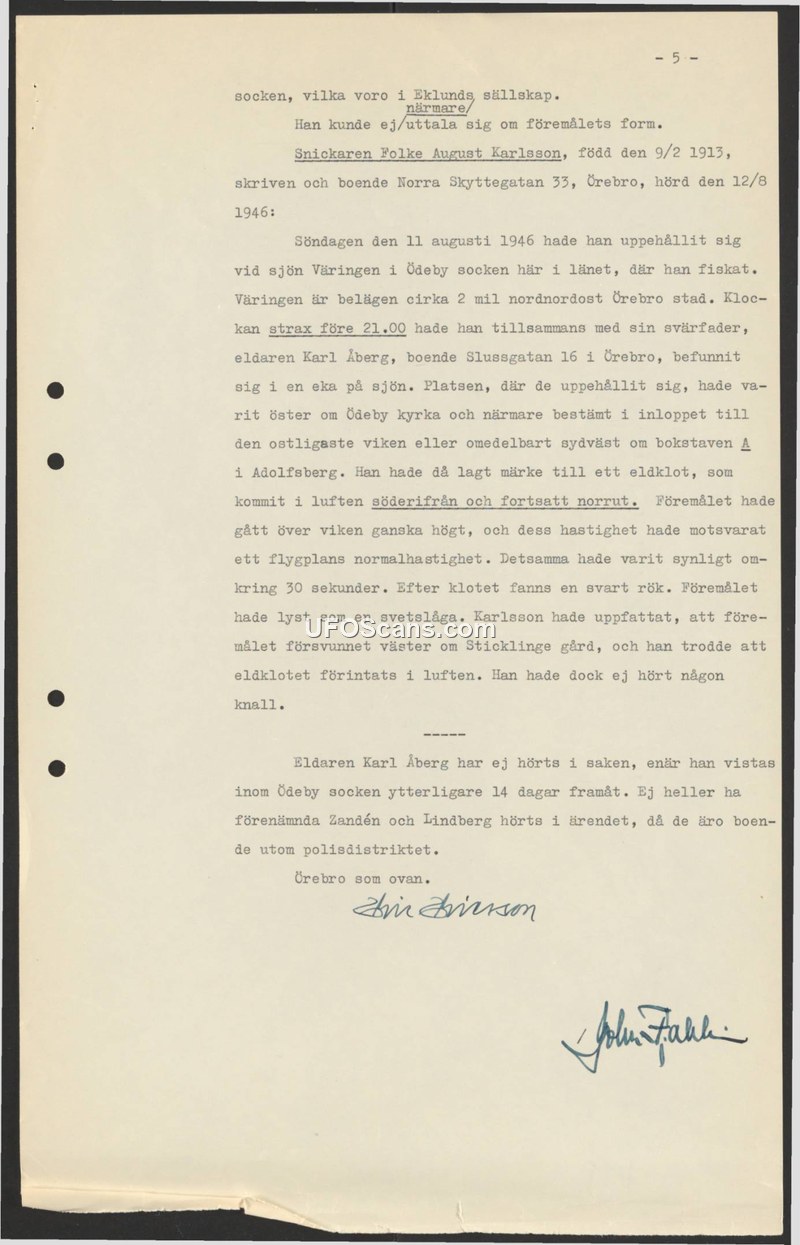 This document is a field report dated August 12, 1946, detailing a sighting of an unidentified aerial object by carpenter Folke August Karlsson. On Sunday, August 11, 1946, shortly before 21:00, Karlsson was fishing in a boat on Lake Väringen in Ödeby parish, accompanied by his father-in-law, Karl Åberg. Karlsson reported observing a fireball that appeared from the south and traveled northward. He described the object as glowing like a welding flame and leaving a trail of black smoke. The object passed over the bay at a high altitude, maintaining a speed comparable to that of a conventional airplane. The sighting lasted approximately 30 seconds before the object disappeared to the west of Sticklinge farm. Karlsson expressed the belief that the object had been destroyed in the air, though he noted that no explosion or sound was heard. The report concludes by noting that Karl Åberg was not interviewed at the time because he was staying in the area for an additional two weeks, and two other individuals, Zandén and Lindberg, were not interviewed because they resided outside the local police district.