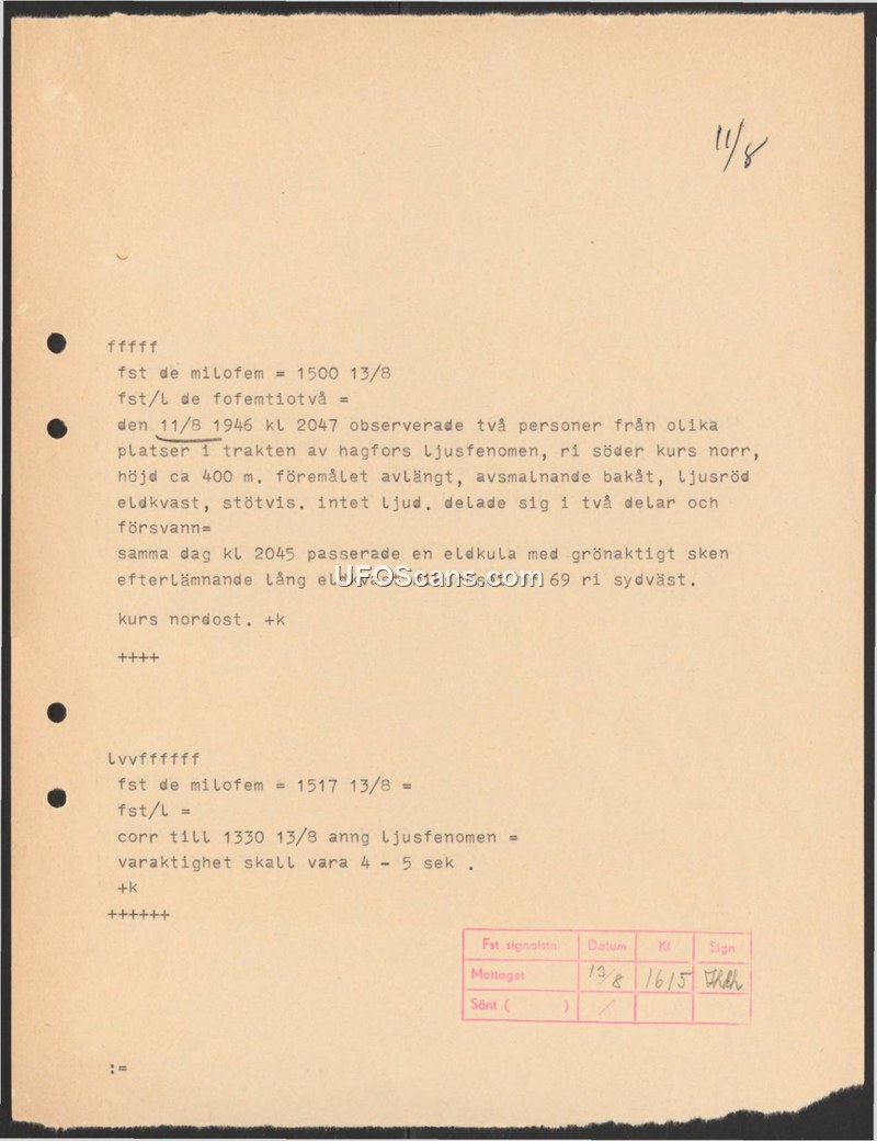 Sighting Report: Hagfors Light Phenomena, 11 August 1946
