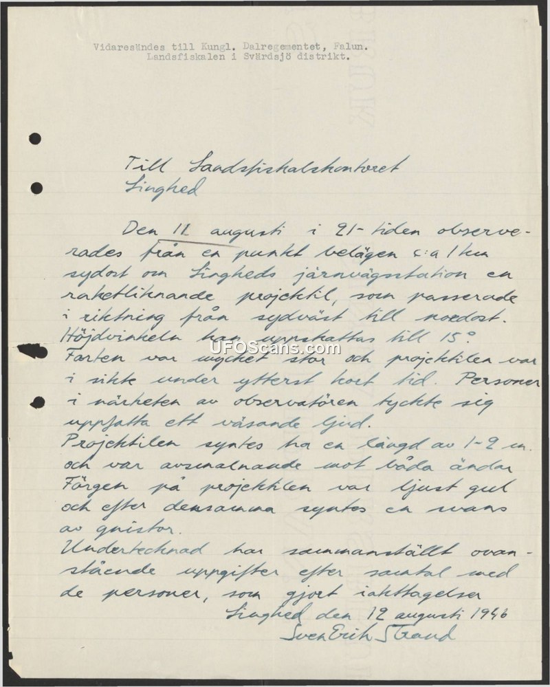 This document is a field report dated August 12, 1946, authored by Sven Erik Strand of the Landsfiskalen (District Prosecutor/Police) in the Svärdsjö district. It was addressed to the Royal Dalarna Regiment (Kungl. Dalregementet) in Falun. The report details an observation made on the evening of August 11, 1946, at approximately 21:00 hours. The sighting occurred from a location approximately one kilometer southeast of the Linghed railway station. Witnesses reported seeing a rocket-like projectile traveling from the southwest toward the northeast. The object was described as being light yellow in color, measuring between one and two meters in length, and tapered at both ends. The witnesses estimated the altitude at 15 degrees and noted that the object moved at a very high speed, remaining in view for only an extremely short duration. Additionally, individuals near the observer reported hearing a whizzing sound. The author states that he compiled this information following conversations with the individuals who made the observations.