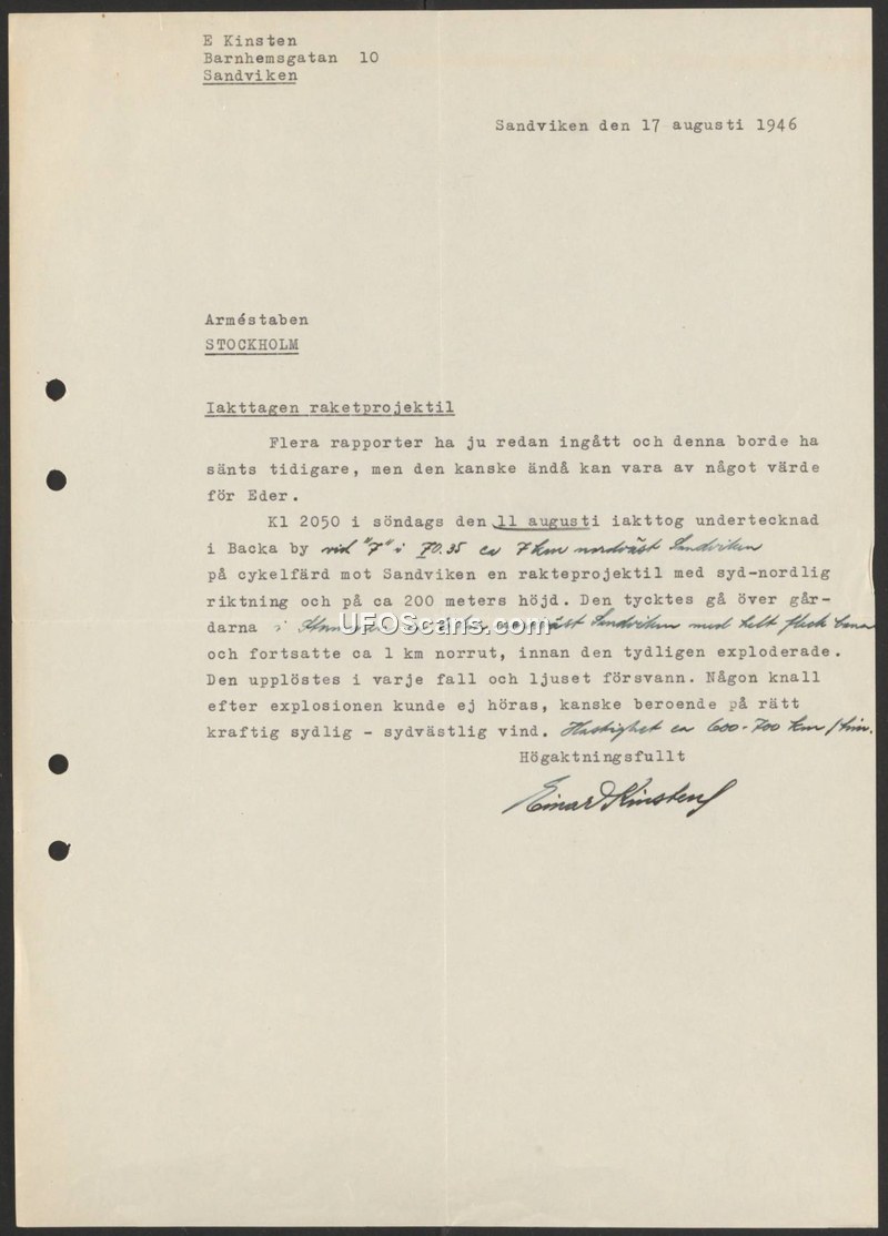 On August 17, 1946, E. Kinsten of Sandviken, Sweden, submitted a report to the Swedish Army Staff (Arméstaben) regarding an aerial sighting that occurred on the evening of August 11, 1946. At 20:50, while cycling in the village of Backa, Kinsten observed a 'rocket projectile' traveling in a south-to-north direction at an altitude of approximately 200 meters. The object continued for about one kilometer before it appeared to explode and dissolve, at which point the light associated with the object vanished. Kinsten noted that no explosion sound was heard, which he attributed to the presence of a strong south-southwesterly wind. The author acknowledged that the report was being submitted late, but expressed hope that the information might still be of value to the Army Staff.