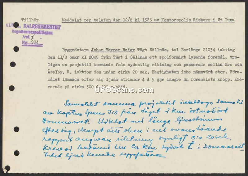 A report from the Dalregementet regarding a sighting of a luminous, spindle-shaped object over Sällnäs, Sweden, on August 11, 1950. The object was observed for 20 seconds at a low altitude and left luminous trails.