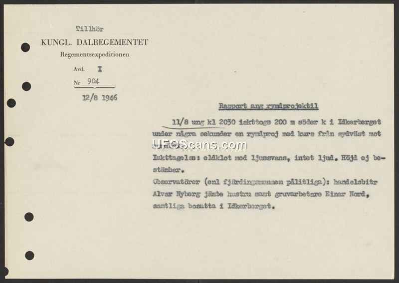 Rapport ang rymdprojektil (Report regarding space projectile) — Idkerberget, Sweden, August 1946