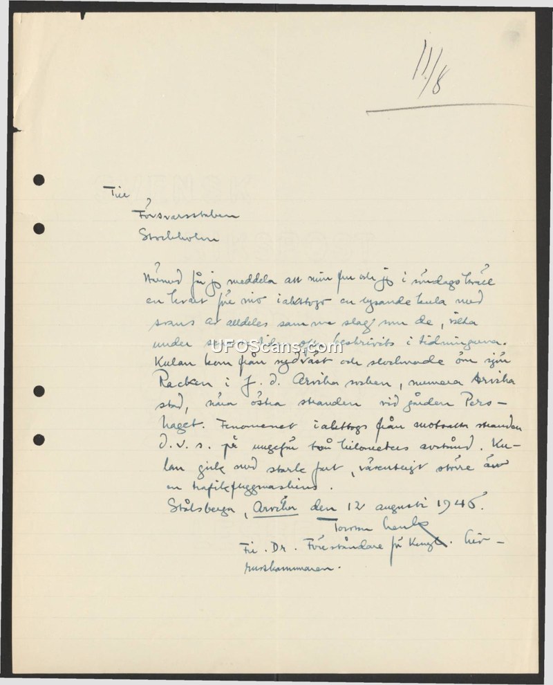 Sighting Report — Stolsberga, Sweden, August 12, 1946