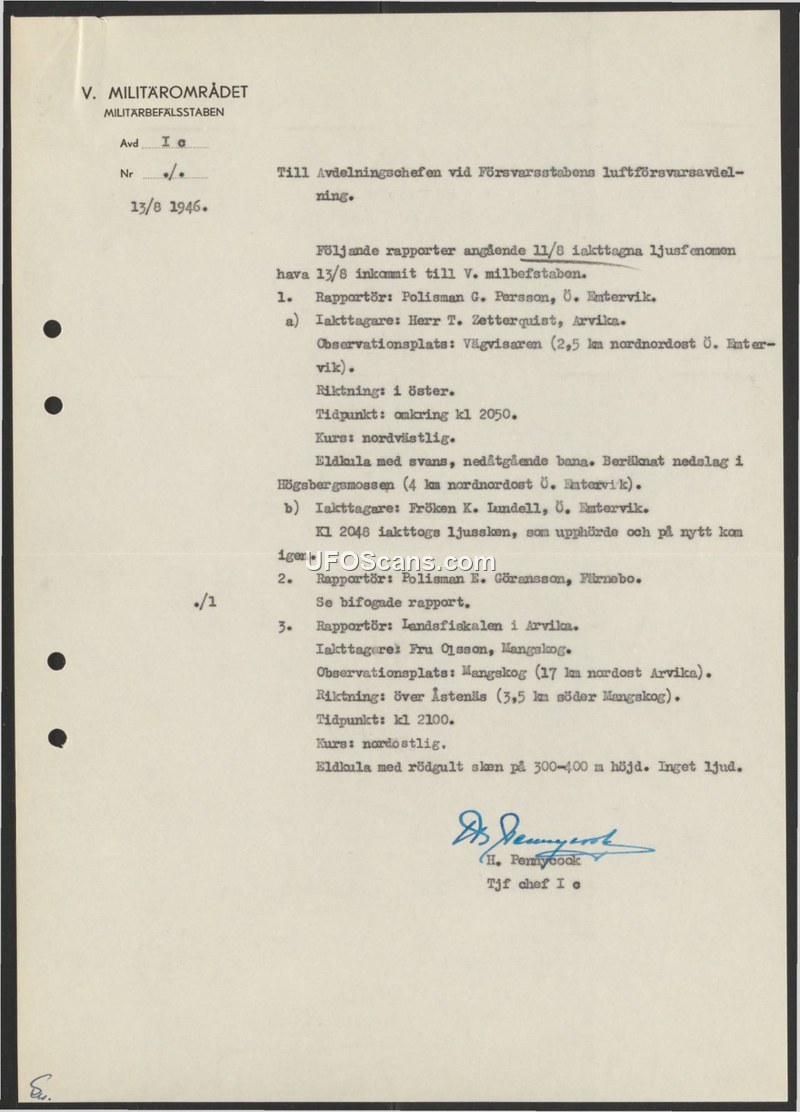 This document is a report issued on August 13, 1946, by the V. Military District (V. Militärområdet) to the Air Defense Department of the Defense Staff. It summarizes three reports received regarding light phenomena observed on August 11, 1946. The first report, filed by Police Officer G. Persson, details an observation by T. Zetterquist near Östra Emtervik. The witness described a fireball with a tail on a descending path, with an estimated impact site at Högsbergsmossen. A second witness, K. Lundell, reported observing a light at 20:48 that ceased and then reappeared. The second report, filed by Police Officer E. Göransson from Färnebo, refers to an attached document. The third report, filed by the District Police Superintendent (Landsfiskalen) in Arvika, details an observation by Fru Olsson in Mangskog at 21:00. She described a fireball with a red-yellow glow at an altitude of 300-400 meters, moving in a northeasterly direction over Åstenäs, with no sound reported. The document is signed by H. Pennycook.