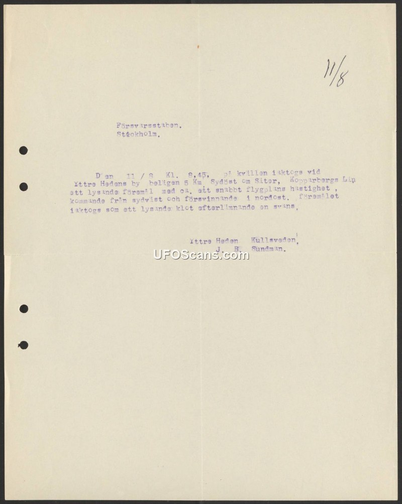 A report to the Swedish Defence Staff regarding a luminous aerial object observed on August 11 near Yttre Hedens. The object moved at the speed of an airplane and left a trail.