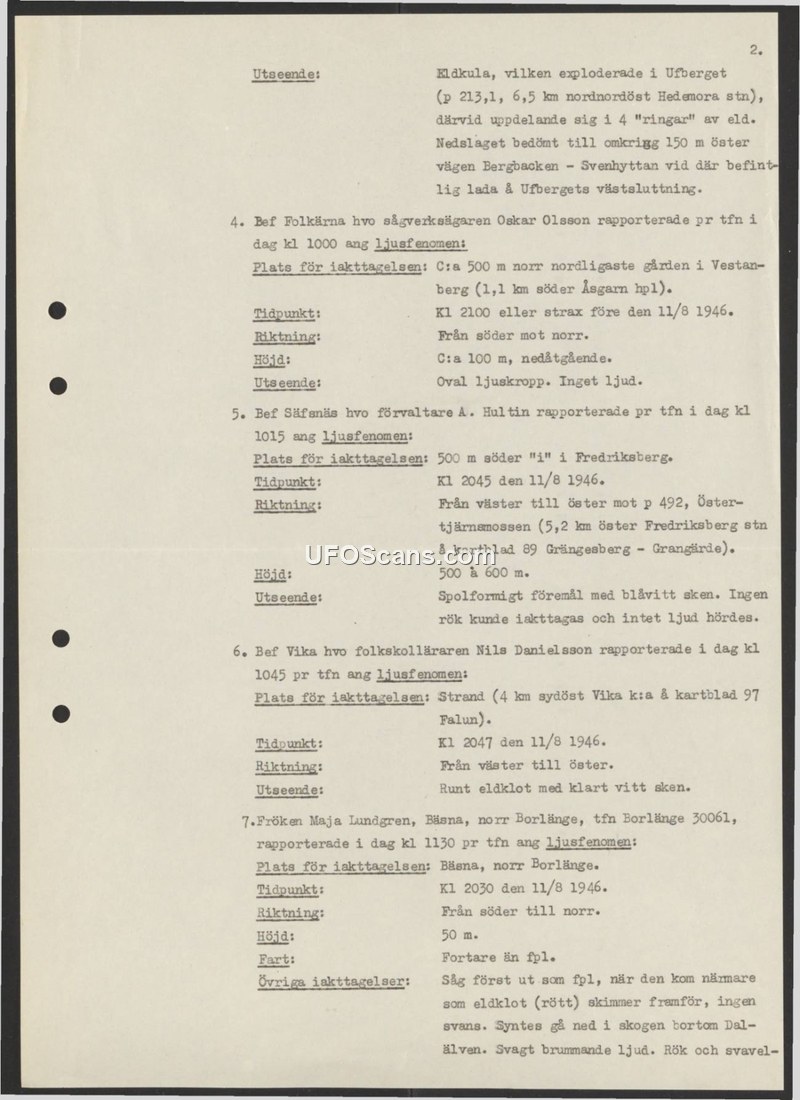 This document is a compilation of four separate reports of light phenomena observed in Sweden on August 11, 1946. The first report, from sawmill owner Oskar Olsson, describes an oval light body seen near Vestanberg at 21:00, moving from south to north at an altitude of approximately 100 meters with no sound. The second report, from manager A. Hultin, details a spool-shaped object with a bluish-white glow observed near Fredriksberg at 20:45, moving from west to east at an altitude of 500 to 600 meters, with no smoke or sound. The third report, from school teacher Nils Danielsson, describes a round fireball with a clear white glow seen near Vika at 20:47, moving from west to east. The final report, from Maja Lundgren in Bäsna, describes a red fireball seen at 20:30 moving from south to north at an altitude of 50 meters. The witness noted the object was faster than an airplane, had no tail, and emitted a faint humming sound, as well as smoke and a sulfur smell as it appeared to descend into the forest beyond the Dalälven river.