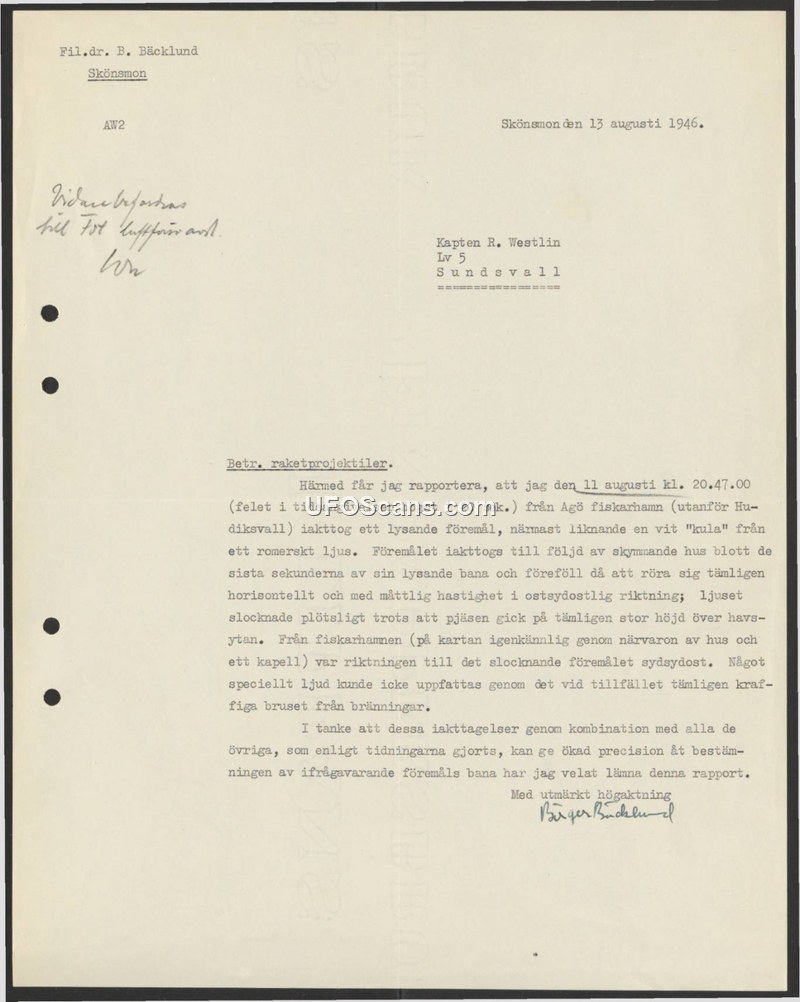 On August 13, 1946, Dr. B. Bäcklund submitted a formal report to Captain R. Westlin of the Lv 5 military unit in Sundsvall, Sweden. The report details a sighting that occurred on August 11, 1946, at 20:47, near the Agö fishing harbor outside Hudiksvall. Bäcklund observed a luminous object that he described as resembling a white ball from a Roman candle. Due to the presence of houses obstructing his view, he was only able to witness the final seconds of the object's flight. During this brief observation, the object appeared to move horizontally at a moderate speed in an east-southeasterly direction. Despite being at a significant altitude above the sea, the light suddenly extinguished. Bäcklund noted that he could not hear any specific sound associated with the object, attributing this to the loud noise of the surf at the time. The author explicitly stated that he provided this account to contribute to the broader effort of determining the trajectory of such objects, referencing other sightings that had been reported in the newspapers at the time.