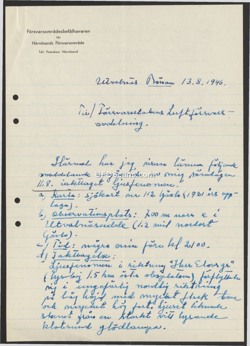 Sighting Report — Utvalnäs, Sweden, August 11, 1946