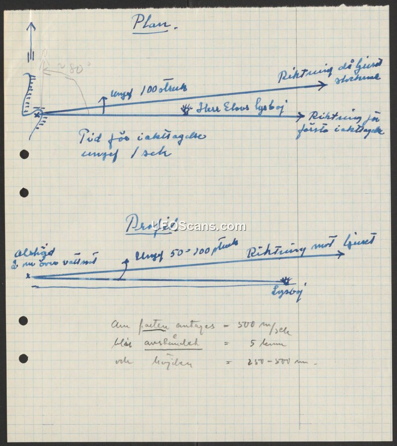 This document contains geometric diagrams and calculations regarding the speed, distance, and altitude of an observed aerial object. It estimates the object's speed at 500 m/sec and altitude at 250-500 meters.