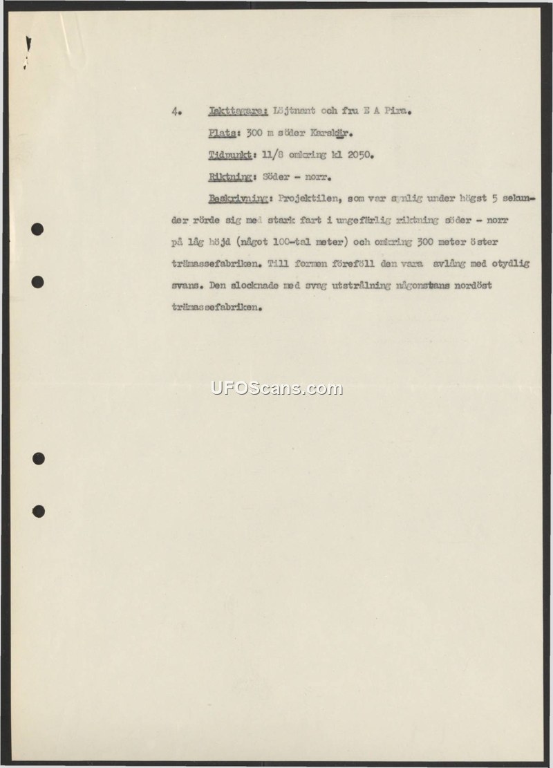 This document is a brief sighting report, numbered 4, detailing an observation made by a Lieutenant and his wife, E. A. Pira. The incident occurred on August 11 at 20:50 hours, at a location 300 meters south of Karskär. The witnesses observed a projectile moving at high speed in a south-to-north direction. The object was visible for a maximum of five seconds at a low altitude, estimated to be in the range of 100 meters, and was positioned approximately 300 meters east of a pulp mill (trämassefabriken). The object was described as having an elongated shape with an indistinct tail. It eventually extinguished itself with a faint glow somewhere to the northeast of the pulp mill.