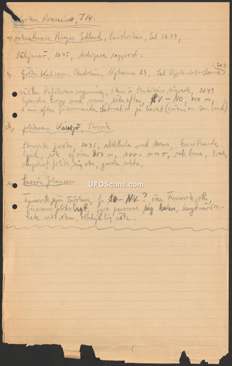 This document is a collection of handwritten field notes documenting multiple civilian sightings of aerial fireballs in Sweden. It serves as a record of witness accounts for further investigation.