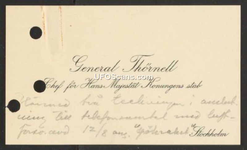 This document is a brief handwritten note addressed to General Thörnell, who served as the Chief of His Majesty the King's Staff. The note references the inclusion of drawings related to a telephone conversation held with the Air Defense on August 12th. The subject of the conversation concerns 'ghost rockets' (spöraketer) in Stockholm. The document serves as a transmittal slip for the mentioned drawings.