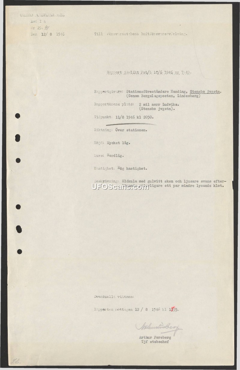 Sighting Report — Stensbo, Sweden, August 11, 1946