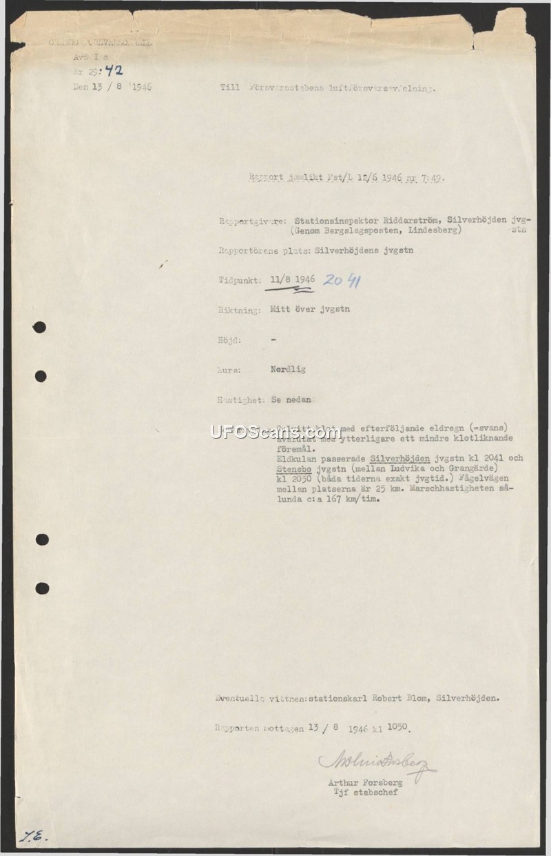 Report regarding sighting on August 11, 1946, in Silverhöjden