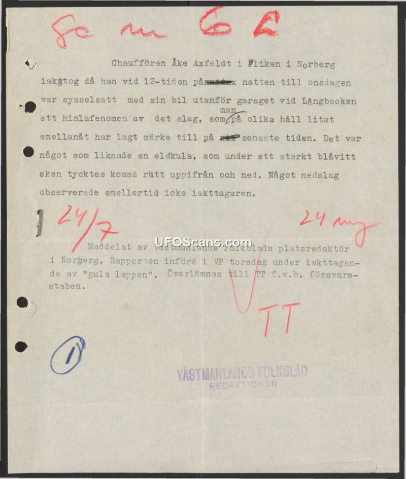 A chauffeur in Norberg, Sweden, reported seeing a blue-white fireball descending from the sky at midnight. The report was documented by a local newspaper and forwarded to the Swedish Armed Forces Staff.