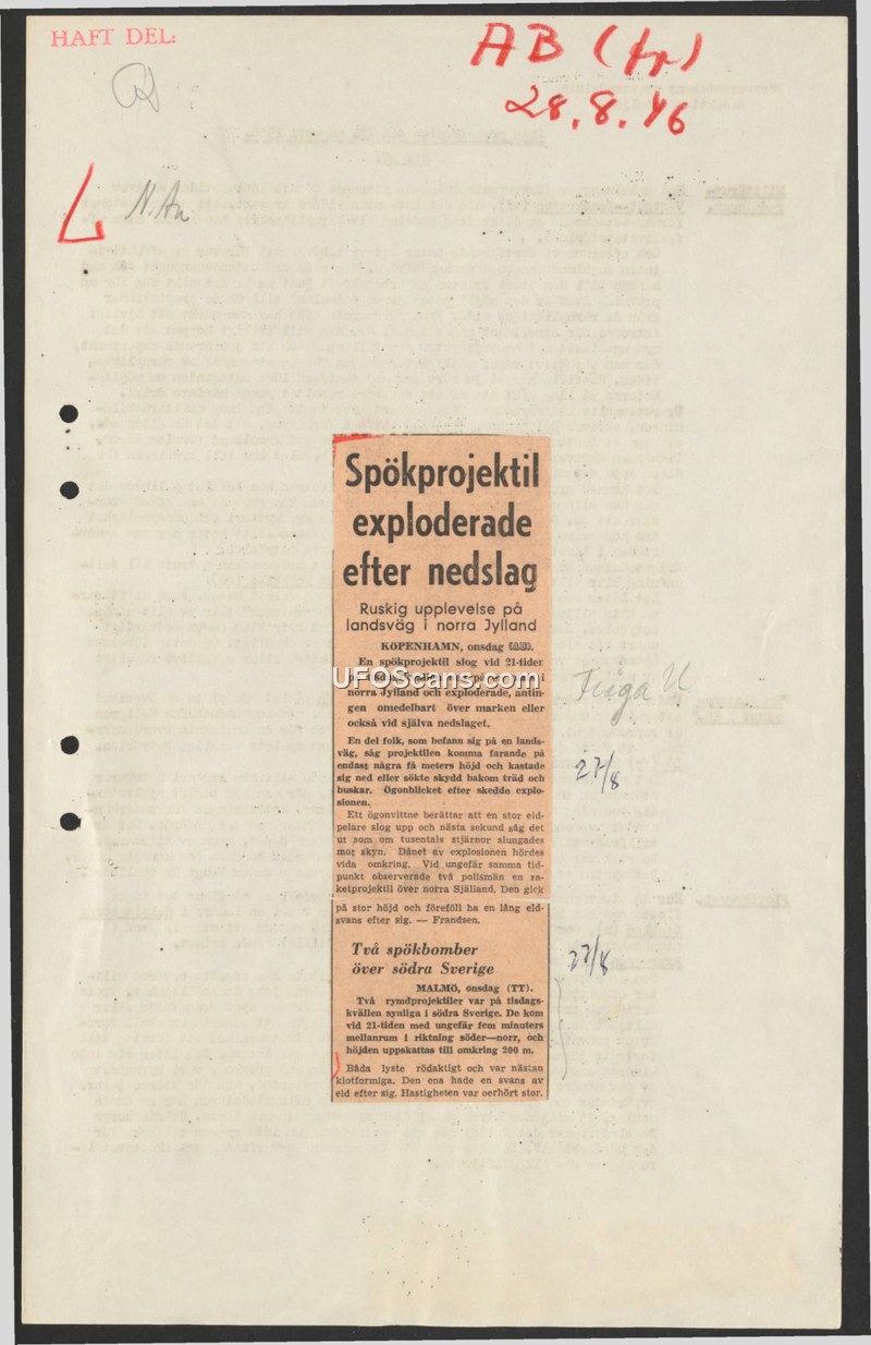 Newspaper reports from August 1946 describe sightings of unidentified aerial objects, referred to as 'ghost projectiles' and 'ghost bombs', over Denmark and Sweden.