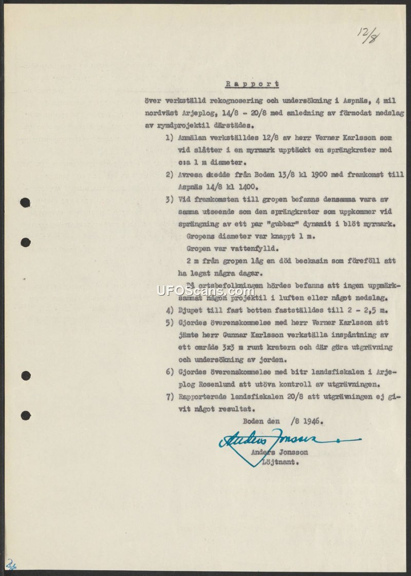 A 1946 Swedish military investigation into a suspected space projectile impact in Aspnäs concluded that the crater was likely caused by dynamite detonation. No evidence of an aerial object was found, and local residents reported no sightings.