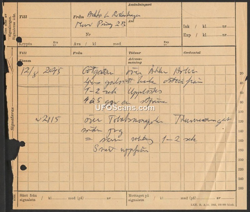 A brief handwritten log from August 12, 1945, documenting two separate aerial observations of objects moving eastward in Sweden.