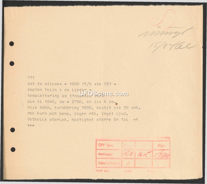 A report from August 15, 1958, documenting a sighting by Captain Folin of an object the size of a football traveling at high speed with no sound or smoke.