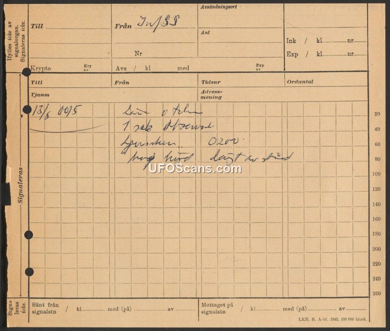 A brief communication log entry from August 13th at 0200 hours, originating from JSS. It contains handwritten notes regarding a high-altitude light or glow.