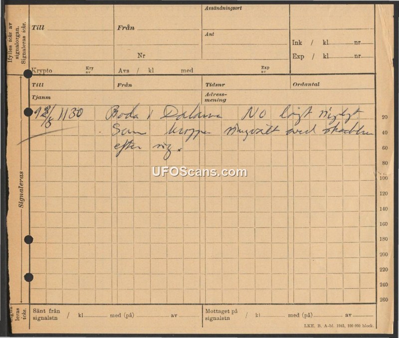 A brief 1945 Swedish military report documenting a low-altitude sighting of an unidentified object in Boda i Dalarna. The object was noted to have a shadow following it.