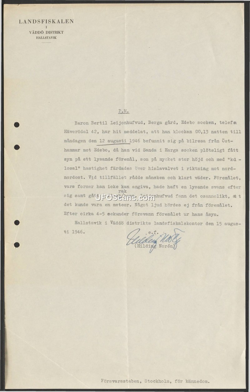 Baron Bertil Leijonhufvud, Berga gård, Edebo socken, telefon Häverödal 42, har hit meddelat, att han klockan 00,13 natten till måndagen den 12 augusti 1946 befunnit sig på bilresa från Östhammar mot Edebo, då han vid Sanda i Hargs socken plötsligt fått syn på ett lysande föremål, som på mycket stor höjd och med "kdL - losal" hastighet färdades över himlavalvet i riktning mot nord nordost.