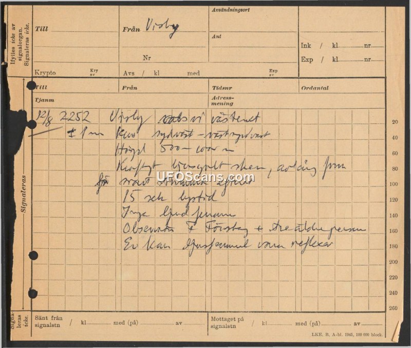 A report from Visby, Sweden, on August 12, 1945, detailing a 15-minute silent aerial observation at 500 meters altitude. The report suggests the object may have been a reflection.