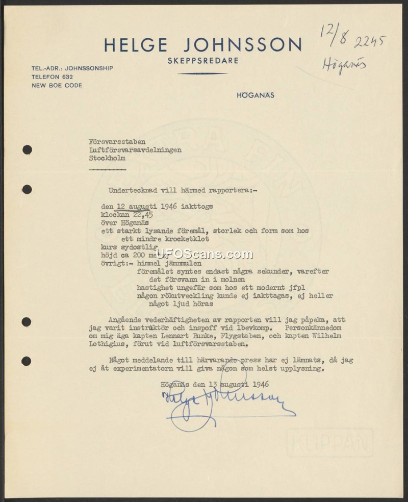 On August 13, 1946, Helge Johnsson, a shipowner from Höganäs, submitted a formal report to the Swedish Defense Staff (Försvarsstaben) regarding an aerial sighting that occurred the previous night. On August 12, 1946, at 22:45, Johnsson observed a brightly shining object over Höganäs. He described the object as being similar in size and shape to a small croquet ball. The object was traveling in a south-easterly direction at an estimated altitude of 200 meters. Johnsson noted that the object was visible for only a few seconds before it disappeared into the clouds. He estimated its speed to be comparable to that of a modern jet aircraft. He explicitly stated that no smoke was observed and no sound was heard. To establish the credibility of his report, Johnsson noted his background as an instructor and officer, citing Captain Lennart Bunke of the Air Staff (Flygstaben) and Captain Wilhelm Lothigius, formerly of the Air Defense Staff, as individuals who could vouch for his character. Johnsson further stated that he had not provided this information to the press, as he did not wish to give any information to experimenters.