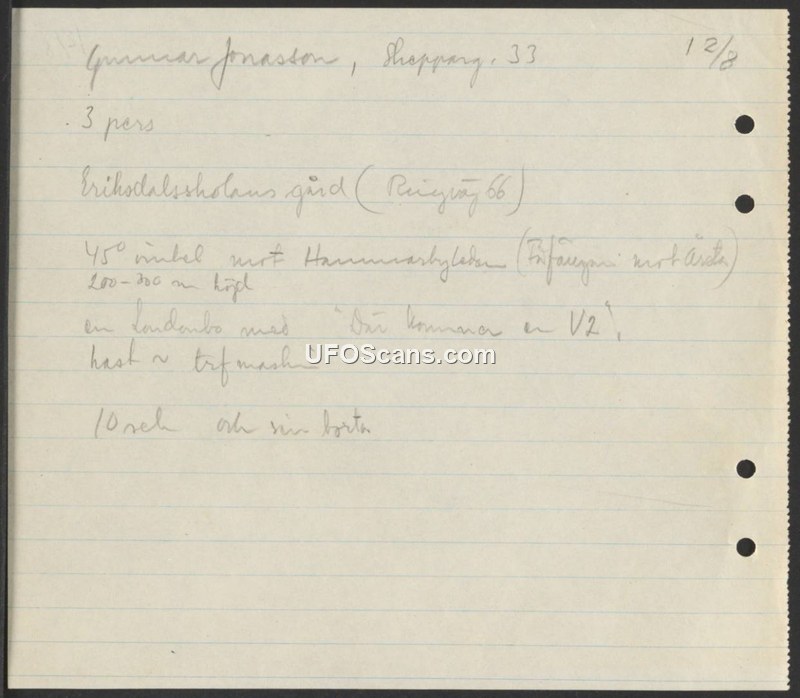 A handwritten note documenting a 10-second sighting of an unidentified object by three witnesses at Eriksdalsskolans gård in Sweden. The object was observed at 200-300 meters altitude and compared by a witness to a V2 rocket.