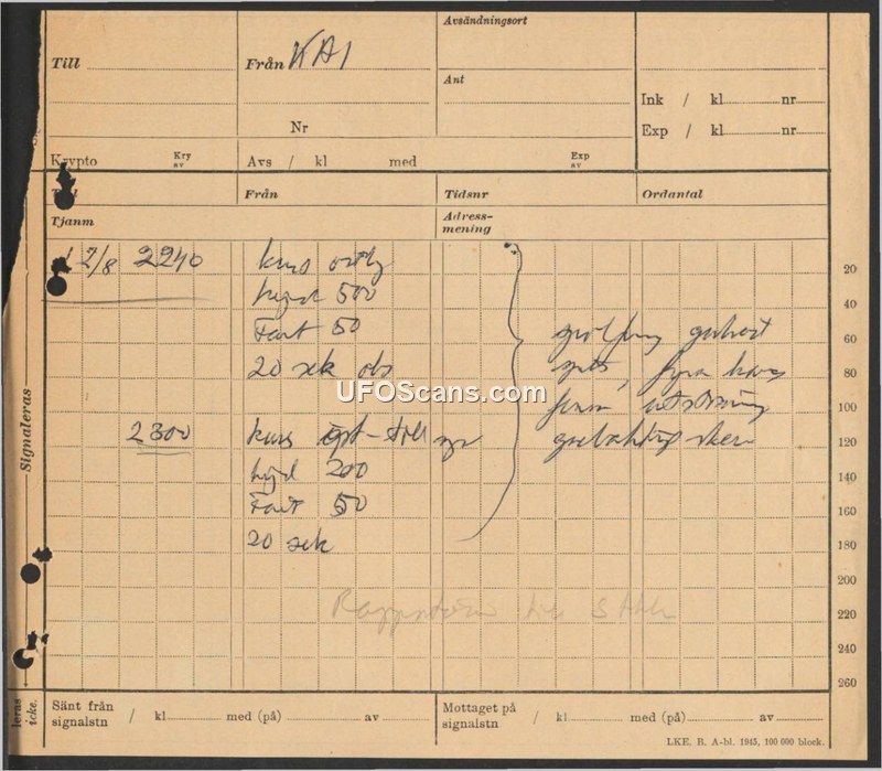 A 1945 Swedish military signal log recording two entries regarding altitude, speed, and course, with a note indicating the information was reported to the staff.