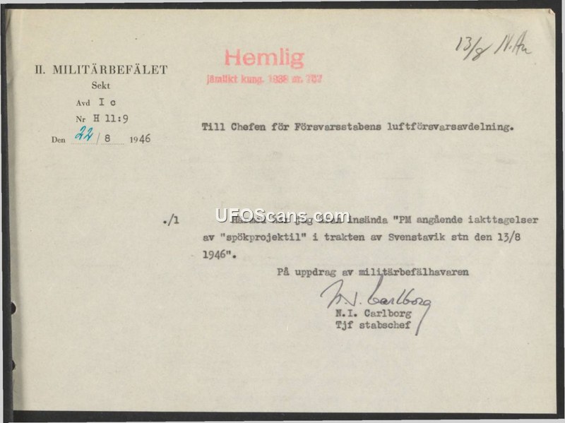Härmed har jag äran insända "PM angående iakttagelser av "spökprojektil" i trakten av Svenstavik stn den 13/8 1946".