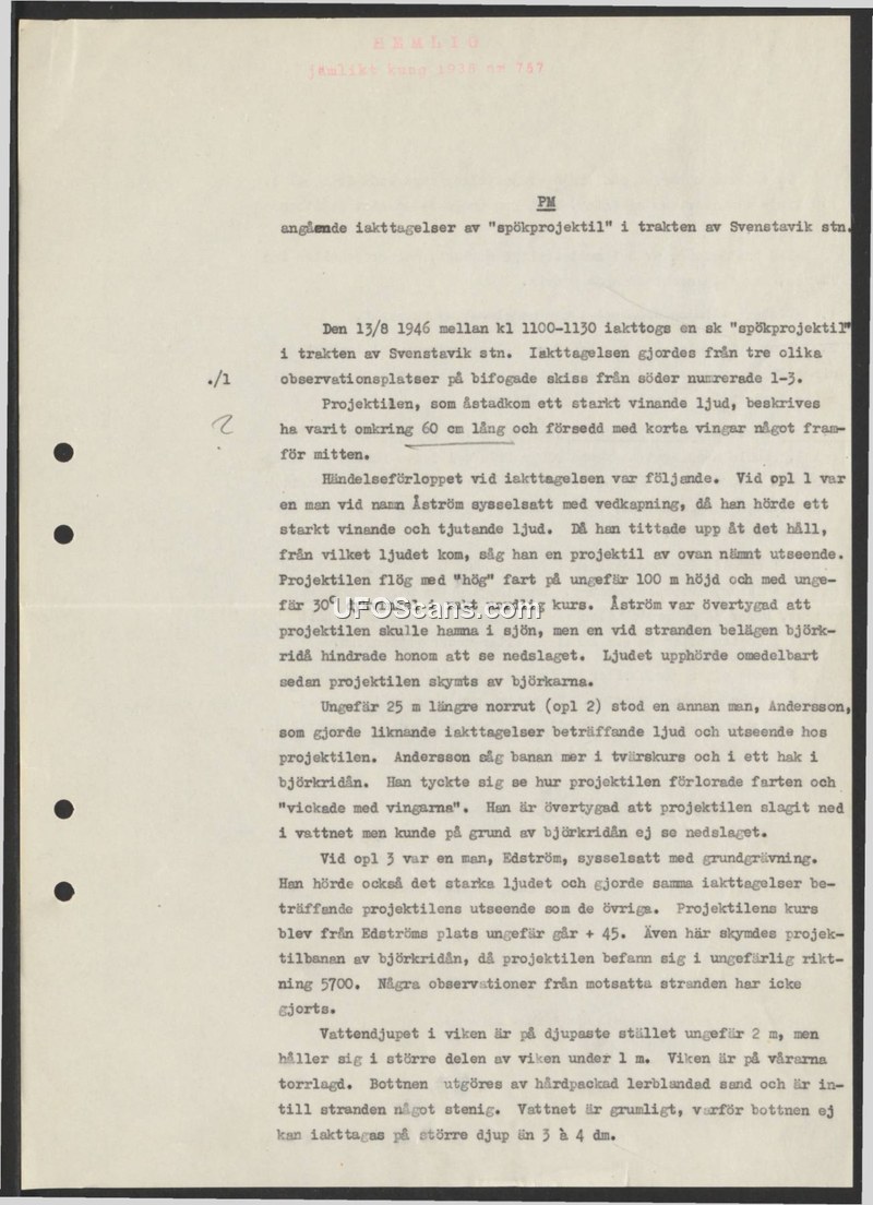 This memorandum, classified as secret (HEMLIG), details a sighting of a 'ghost projectile' (spökprojektil) near the Svenstavik station on August 13, 1946, between 11:00 and 11:30. The report documents observations from three distinct locations, identified as 1, 2, and 3 on an attached sketch. The object was described as approximately 60 centimeters long, equipped with short wings positioned slightly forward of the center. It produced a loud whistling and howling sound. The first witness, Åström, observed the object flying at a high speed at an altitude of roughly 100 meters on a straight northward course with a 30-degree dive angle. He believed it would land in the lake, but his view was blocked by a curtain of birch trees. A second witness, Andersson, located 25 meters to the north, observed the object in cross-section and noted it losing speed and 'wobbling with its wings' before disappearing behind the trees. A third witness, Edström, also heard the loud noise and observed the object's course before it was obscured by the same birch curtain. The document concludes with a description of the lake's geography, noting that the water is shallow, murky, and that the bottom is composed of hard-packed sand and stone, making it difficult to observe the lake floor at depths greater than 3 to 4 decimeters.