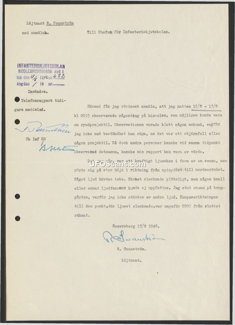 On August 13, 1946, Lieutenant R. Svanström of the Infanteriskjutskolan (Infantry Firing School) submitted a formal report regarding an aerial observation made during the night of August 12-13, 1946. At 00:15, Svanström observed an object in the sky that he described as a powerful light in the form of a tail. The object was moving at a high altitude, traveling from the south-southeast toward the north-northwest. The observation lasted only a few seconds. Svanström noted that he heard no sound, and the object disappeared suddenly without any accompanying noise or explosion. He was standing alone in the courtyard of the castle at Rosersberg at the time, ensuring he was not distracted by other ambient sounds. Svanström explicitly stated that he could not determine with certainty whether the object was a shooting star or a projectile, but he chose to file the report in the event that others had witnessed the same phenomenon, suggesting his account might be of value.