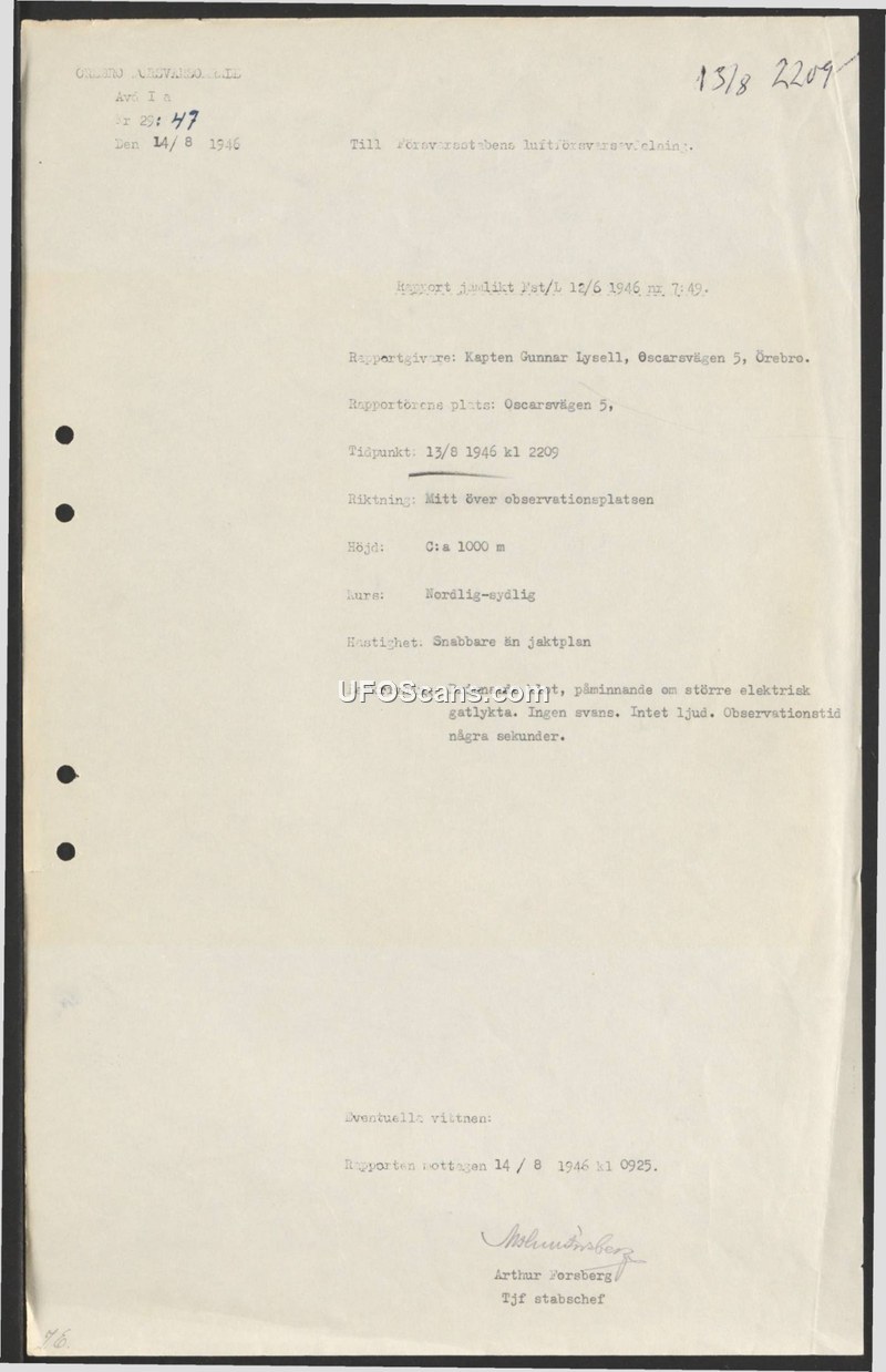 Sighting Report — Örebro, Sweden, August 13, 1946