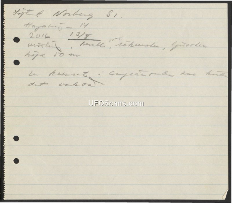 A brief handwritten report documenting an aerial sighting in Norberg, Sweden, on August 13, 2016, at an altitude of 50 meters.