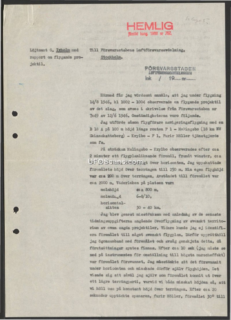 A Swedish military pilot reports an encounter with an unidentified, airplane-like object on August 14, 1946. The report was filed with the Swedish Defense Staff in the context of ongoing concerns regarding unidentified projectiles over Swedish territory.