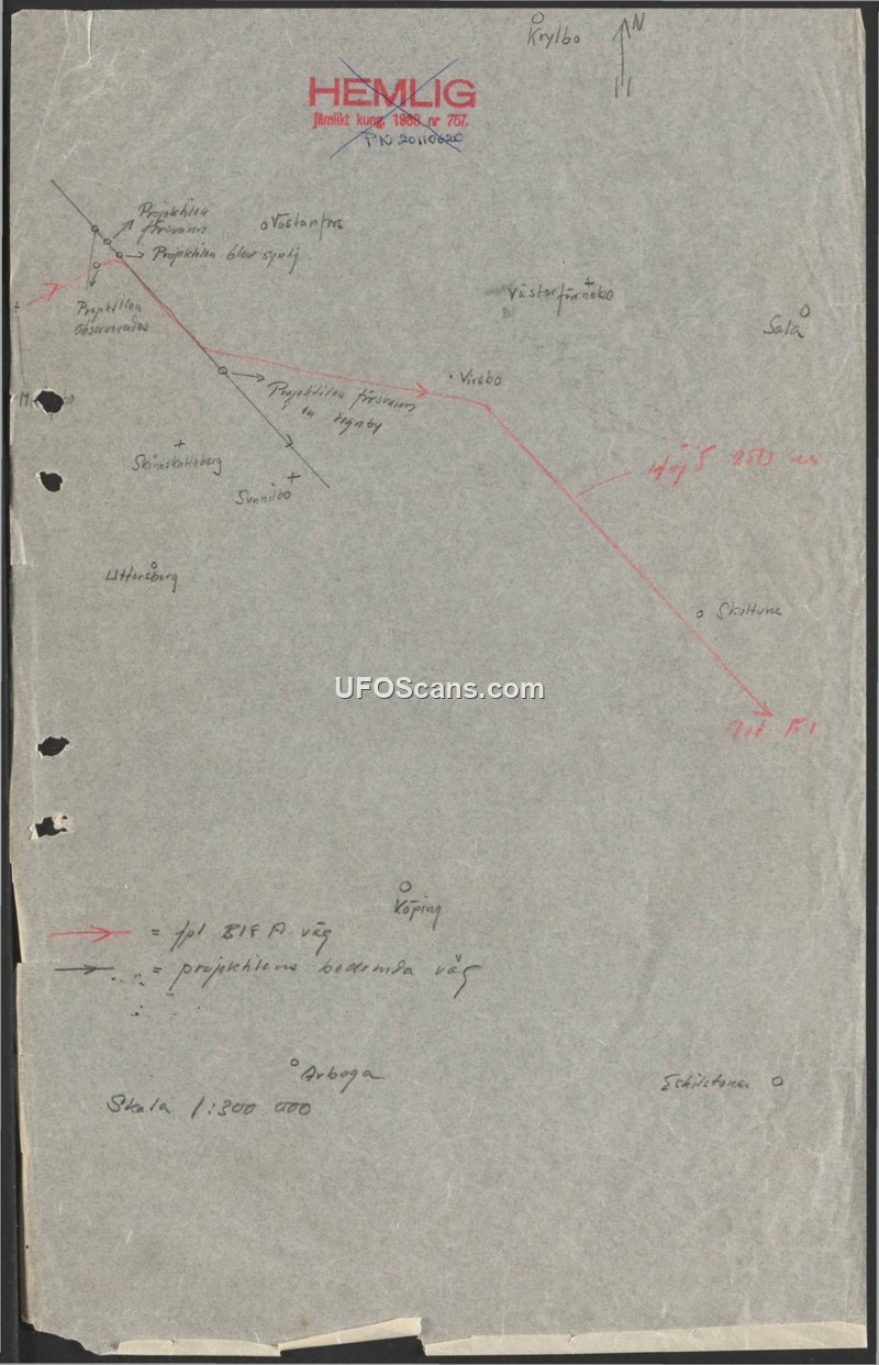 A classified Swedish military map illustrating the flight path of an unidentified object relative to an aircraft (fpl 818 A). The map tracks the object's movement across various Swedish towns toward an air base.