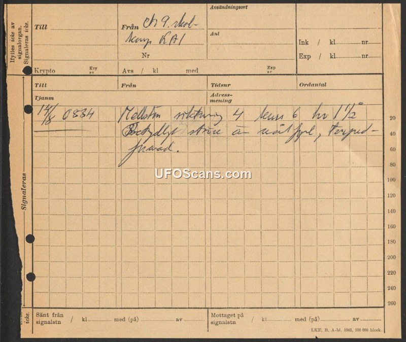 A brief 1945 Swedish military report documenting the sighting of an object described as being significantly larger than a torpedo-shaped object.