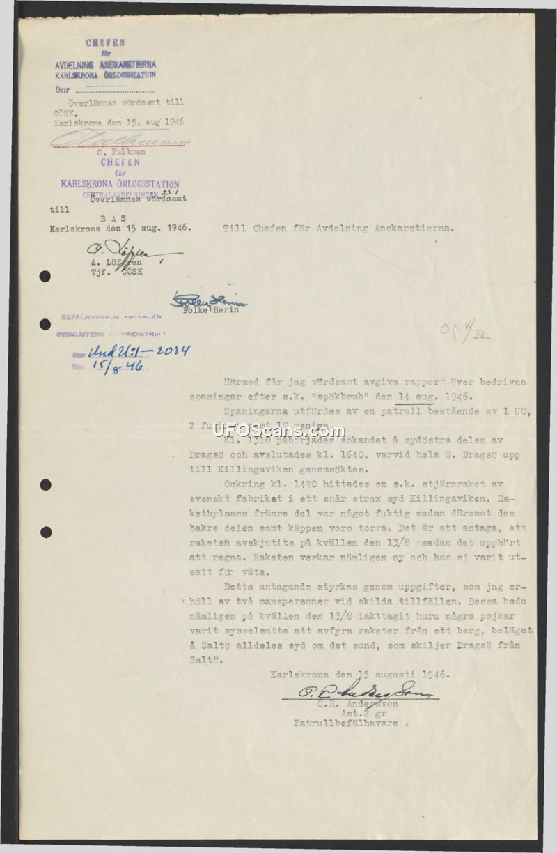 Härmed får jag vördsamt avgiva rapport över bedrivna spaningar efter s.k. "spökbomb" den 14 aug. 1946.