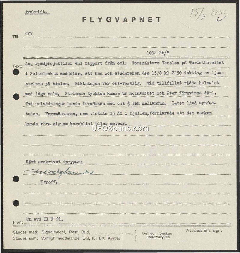 A report from the Swedish Air Force detailing a 1950 sighting of a light streak in Saltoluokta. The witness, an experienced mountain resident, ruled out natural phenomena like meteors or heat lightning.