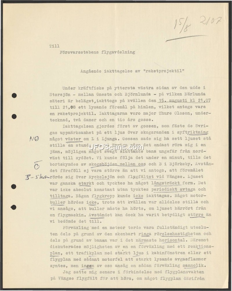 This document is a report submitted to the Swedish Defense Staff's Aviation Department regarding a sighting of an unidentified luminous object on the evening of August 15. The incident occurred while the witnesses, including Major Thure Olsson, were fishing on the western side of the Storsjön lake, near the Närlunda estate. The object was first spotted by a ten-year-old boy at 21:07. The witnesses observed the object for approximately one minute as it moved in a steady, slightly descending path from the northwest toward the southeast, before it was obscured by a forest ridge. The object was described as a bright, somewhat elongated light that periodically fluctuated in intensity. Despite the evening being perfectly still, no engine noise was heard, and no physical aircraft structure was visible. The witnesses explicitly ruled out the possibility of a meteor due to the object's slow speed and horizontal trajectory. They also discussed and dismissed the likelihood of it being a reaction plane, a commercial aircraft with cabin lights, or a plane with engine trouble, as none of these explanations seemed plausible to the observers. The author of the report notes that they subsequently contacted the aircraft guard at the Vängse airfield to inquire about any flight activity.