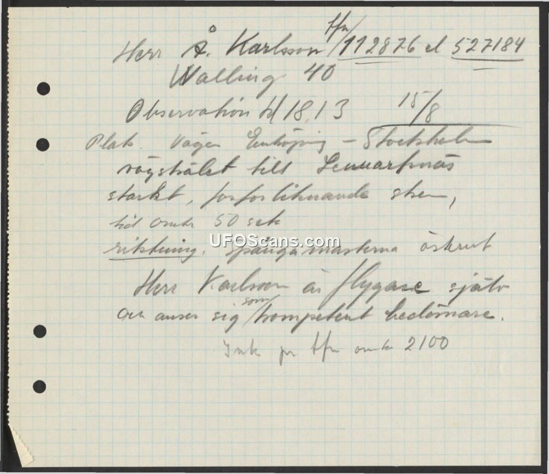 A pilot reported observing a light-like object for 50 seconds while driving between Enköping and Stockholm on August 18, 1976. The report was documented via telephone.