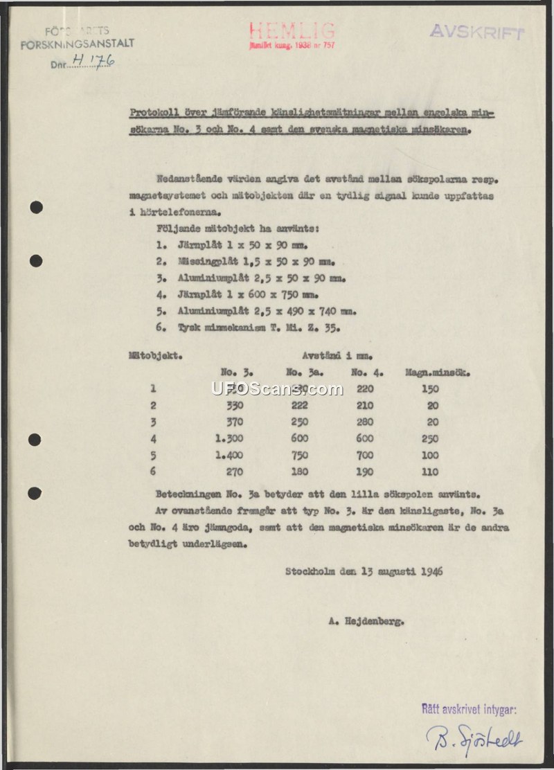 This document, dated August 13, 1946, and issued by the Swedish National Defence Research Institute (Försvarets Forskningsanstalt), details the results of comparative sensitivity tests conducted on English mine detectors (designated No. 3 and No. 4) and a Swedish magnetic mine detector. The objective of the study was to determine the distance at which a clear signal could be detected in the headphones of these devices when exposed to six specific test objects. The test objects included various sizes of iron, brass, and aluminum plates, as well as a German mine mechanism identified as T. Mi. Z. 35. The results are presented in a table, showing the detection distance in millimeters for each device against each object. The report concludes that the No. 3 detector is the most sensitive, that the No. 3 and No. 4 detectors perform at a similar level, and that the Swedish magnetic mine detector is significantly less effective than the English models tested. The document is signed by A. Hejdenberg and certified as a true copy by B. Sjöstedt.