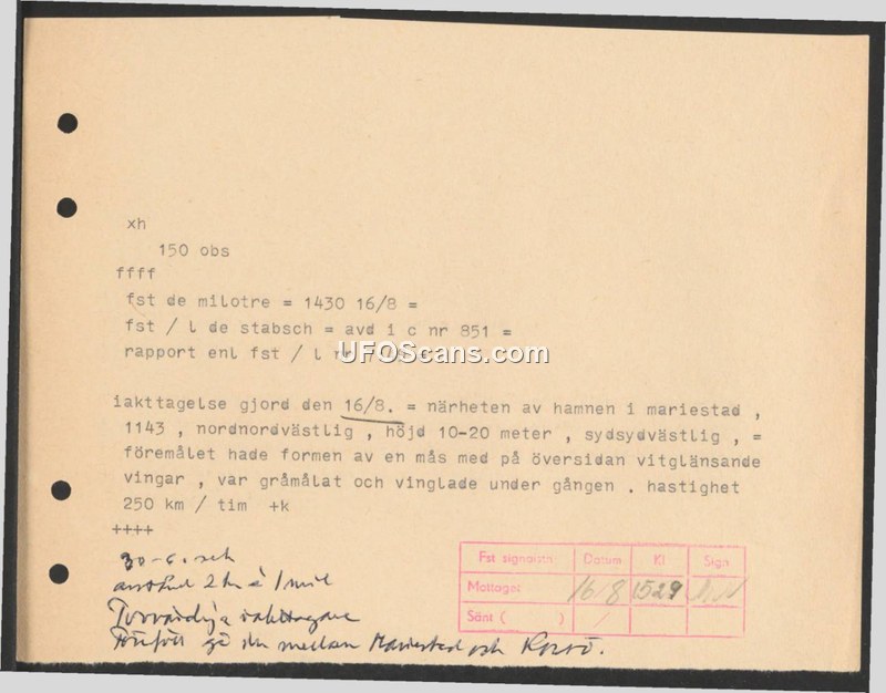 A military report from the Swedish Defense Staff detailing a sighting of a grey, seagull-shaped object near Mariestad harbor on August 16. The object was observed flying at 250 km/h at a low altitude.