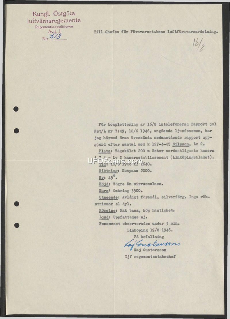 A report from the Royal Östgöta Anti-Aircraft Regiment detailing a sighting of an oblong, silver, high-speed object on August 16, 1946. The object was observed by a military witness at the I 4 - Lv 2 garrison in Linköping.