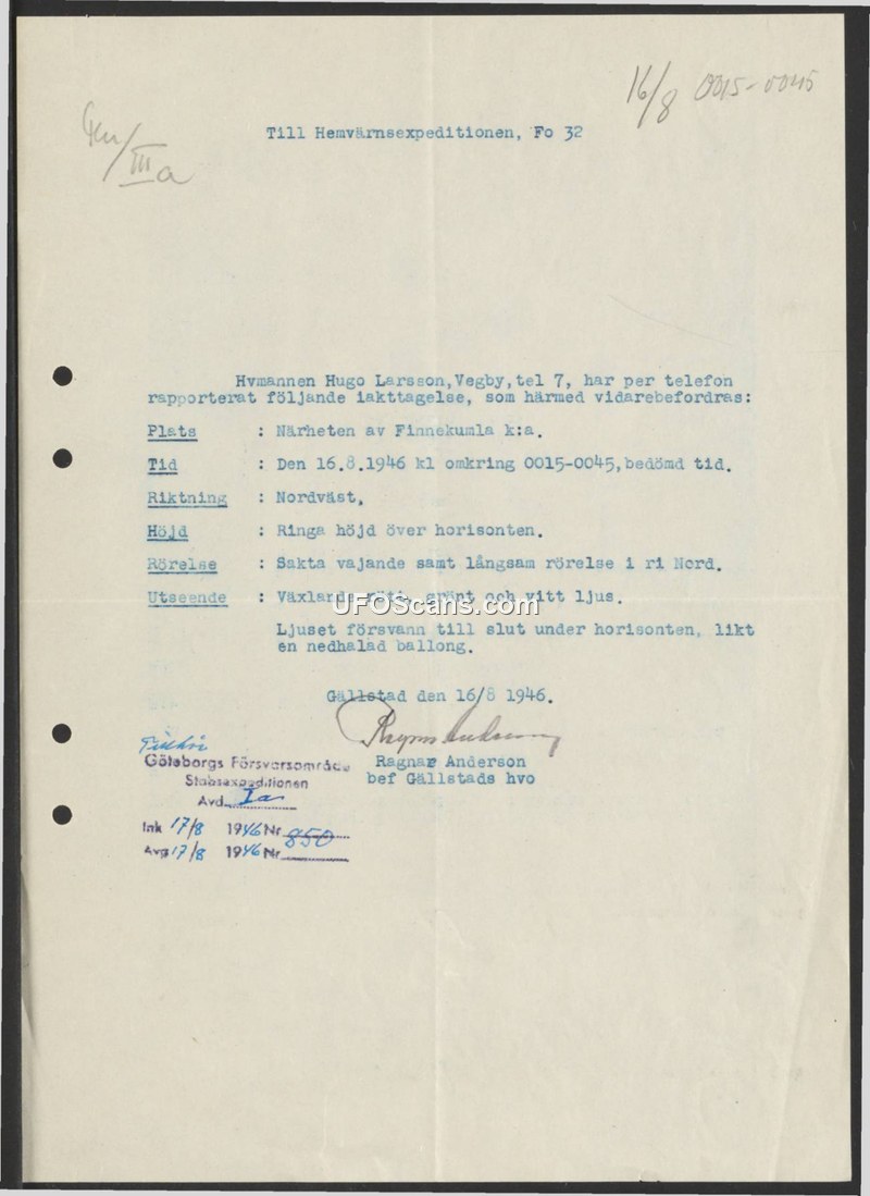 Sighting Report — Hugo Larsson, Gällstad, 16 August 1946