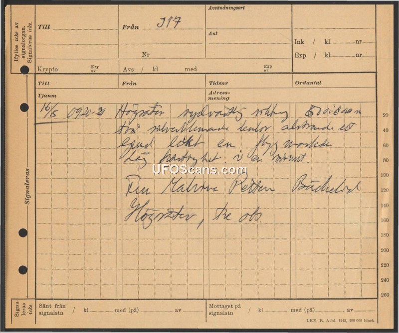The document records a sighting of two silver-colored objects moving at high speed near Hogräter on May 16th.