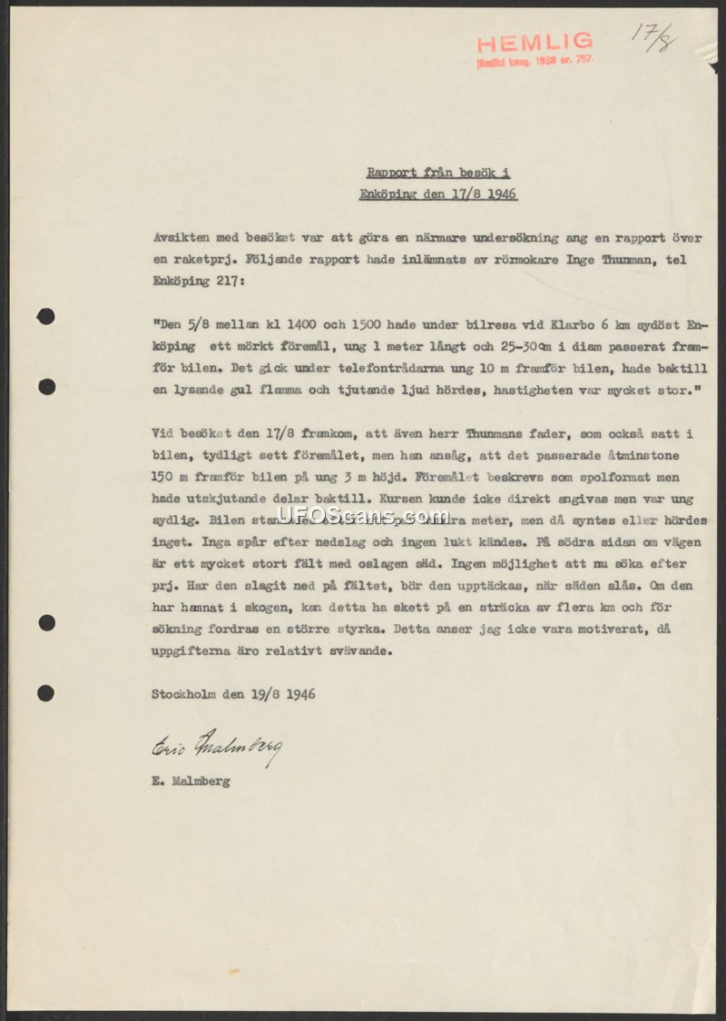 This document is a secret field report dated August 19, 1946, detailing an investigation into a sighting reported by a plumber named Inge Thunman. On August 5, 1946, between 14:00 and 15:00, Thunman and his father were driving near Klarbo, 6 km southeast of Enköping, when they observed a dark, spool-shaped object approximately 1 meter long and 25-30 cm in diameter. The object reportedly passed in front of their vehicle at a height of about 3 meters, moving under telephone wires. The witnesses described the object as having a glowing yellow flame at the rear, protruding parts, and emitting a whistling sound. The object's speed was described as very high, and its course was roughly southerly. The witnesses stopped their car a few hundred meters later but saw or heard nothing further. The investigator, E. Malmberg, visited the site on August 17, 1946. He noted that there were no signs of impact and no odors detected. The area consists of a large field of uncut grain, making a search for any potential 'rocket project' debris impossible at the time. Malmberg concluded that any further search was unjustified because the information provided by the witnesses was relatively vague.