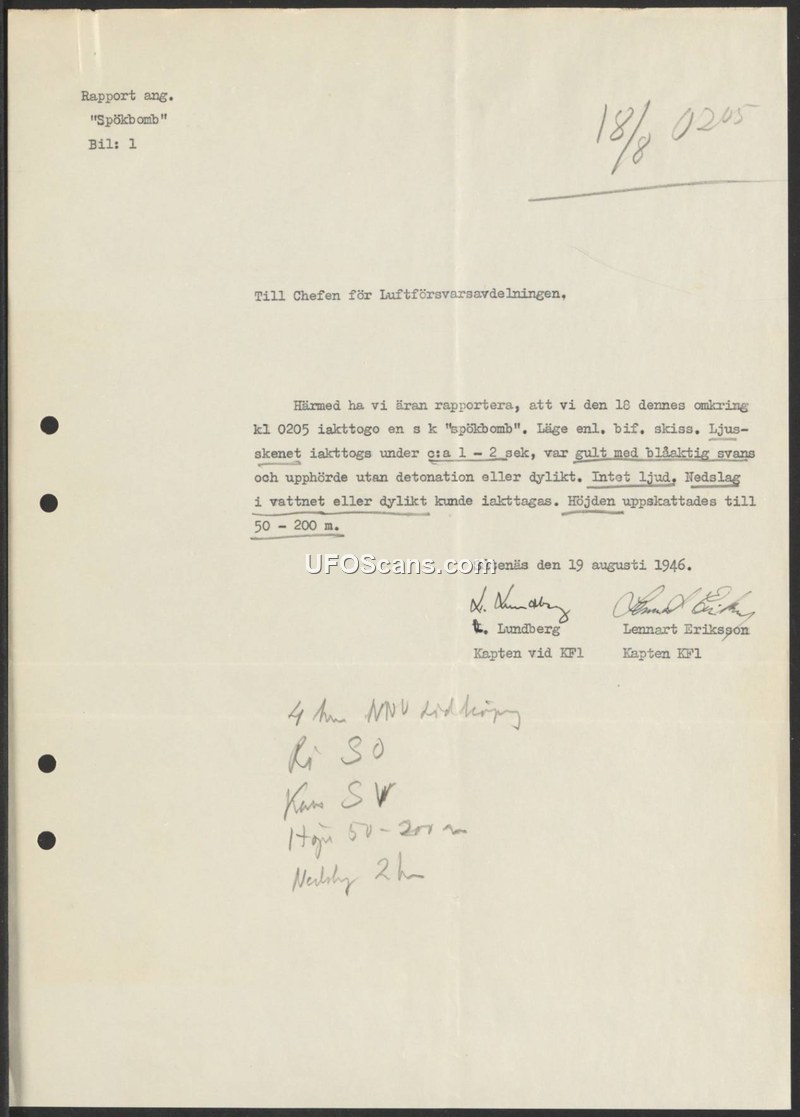 On August 19, 1946, two officers from the Swedish military unit KF1, Captain T. Lundberg and Captain Lennart Eriksson, filed a report regarding a sighting of a 'ghost bomb' (Spökbomb). The incident occurred on August 18, 1946, at approximately 02:05. The witnesses described observing a yellow light with a bluish tail for a duration of one to two seconds. The object was estimated to be at an altitude between 50 and 200 meters. The report notes that the light ceased without any detonation or sound, and no impact in the water or elsewhere was observed. The document references an attached sketch of the incident's location.