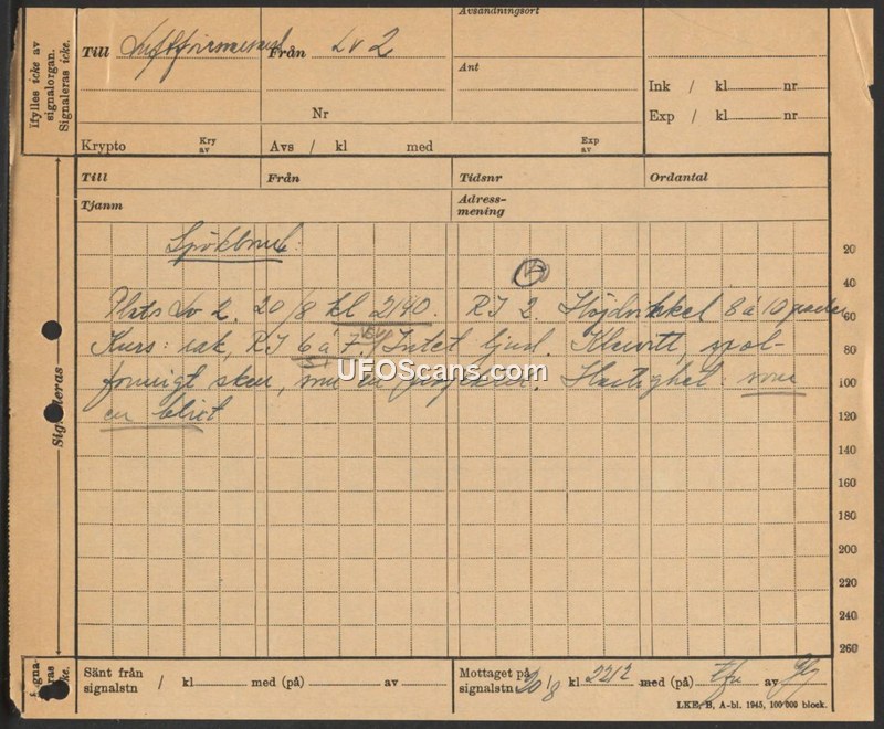 A military report from August 20, 1945, documenting the sighting of a silent projectile traveling on a straight course at an altitude of 8 to 10 degrees.